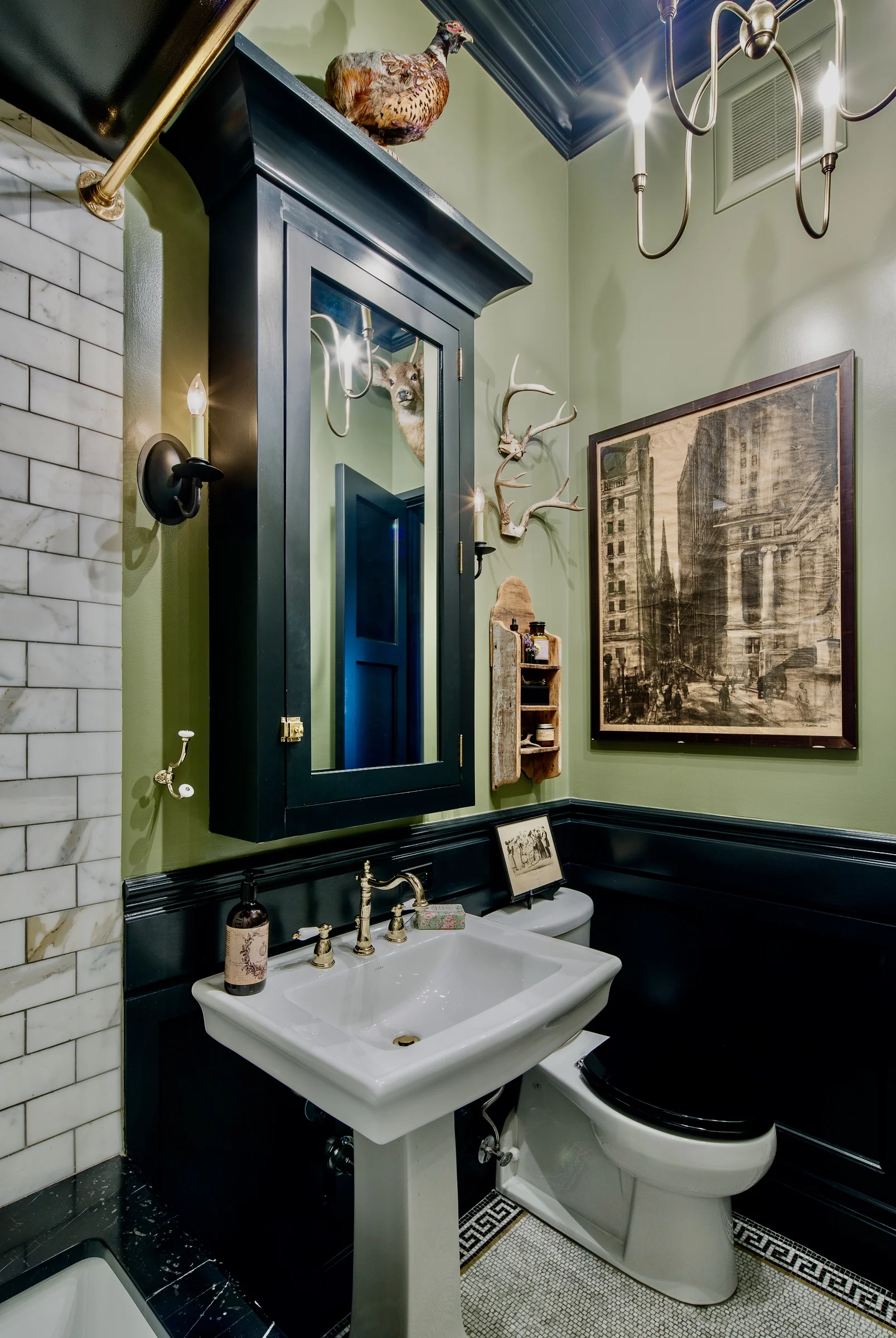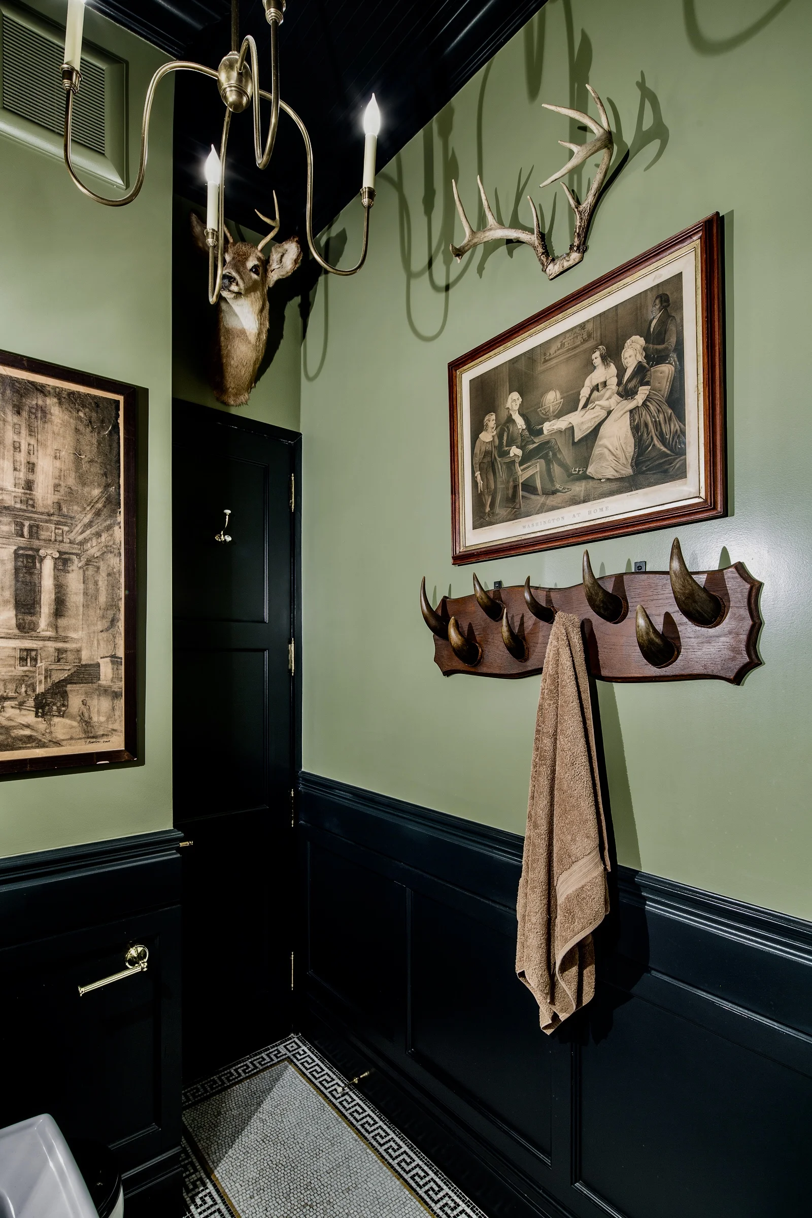 The Morse Building (built by Samuel of Morse Code fame) is a registered landmark uniquely situated in a NYC neighborhood steeped in American History. Paying homage to this location —developed by our founding fathers and embraced by American literary great, Edgar Allen Poe who spent time writing at the adjacent Temple Court--was imperative to the theme of this project. The color palettes, textiles, and upholstery were inspired by Early American menswear, hunting attire, and American Folk Art. China patterns were influenced by early American Delft tiles. Antique furnishings and rugs were individually curated from all over New England for their regal-but-rustic patina-ed quality, maintaining a comfortable, threadbare feel. The space is livable, and functional, not stuffy. Keeping in theme with the more macabre shades of Poe, a darker color palette was chosen to compliment the client’s antique taxidermy and French erotic postcard collections. The nod to French aesthetic trends that were popular in a budding America help to soften and offset the masculine colonial details.