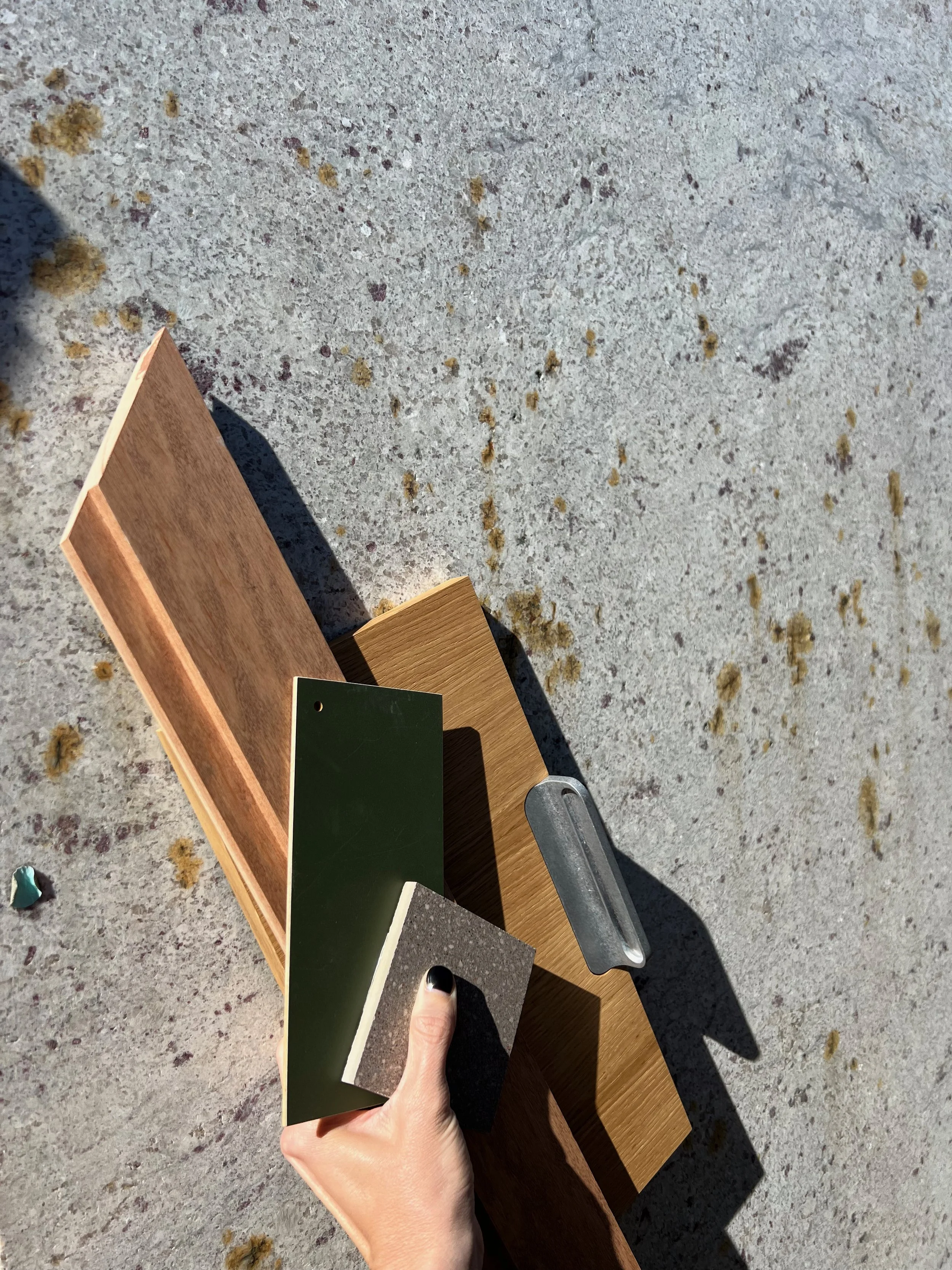 Left : 60’s era color-saturated chalet glass doors were replaced with modern clear glass paned doors and an existing transom was enlarged to draw light deep into the space. The former kitchen overhang housing an exhaust was raised, and the range was relocated to create a peninsula with seating. A former laundry closet was transformed into a mirrored wet bar—allowing the family room, kitchen, and dining area to flow as one. Right : Due to it’s location at the center of the home, SO chose a gray bone-toned variation of the sandy mauve tile used in other areas of the home to brighten the space, while green cabinetry and hardware subtly nod once again to the home’s original green carpet from the original design. Below : Granite countertops were selected for their natural imperfections; weathered in the stone yard, iron exposure created subtle ochre and plum veining that adds modern character and complements the warmth of the oak kitchen cabinetry. These “stone-al” tones went on to inspire the color palette SO selected for furniture, rugs, and finishes throughout.
