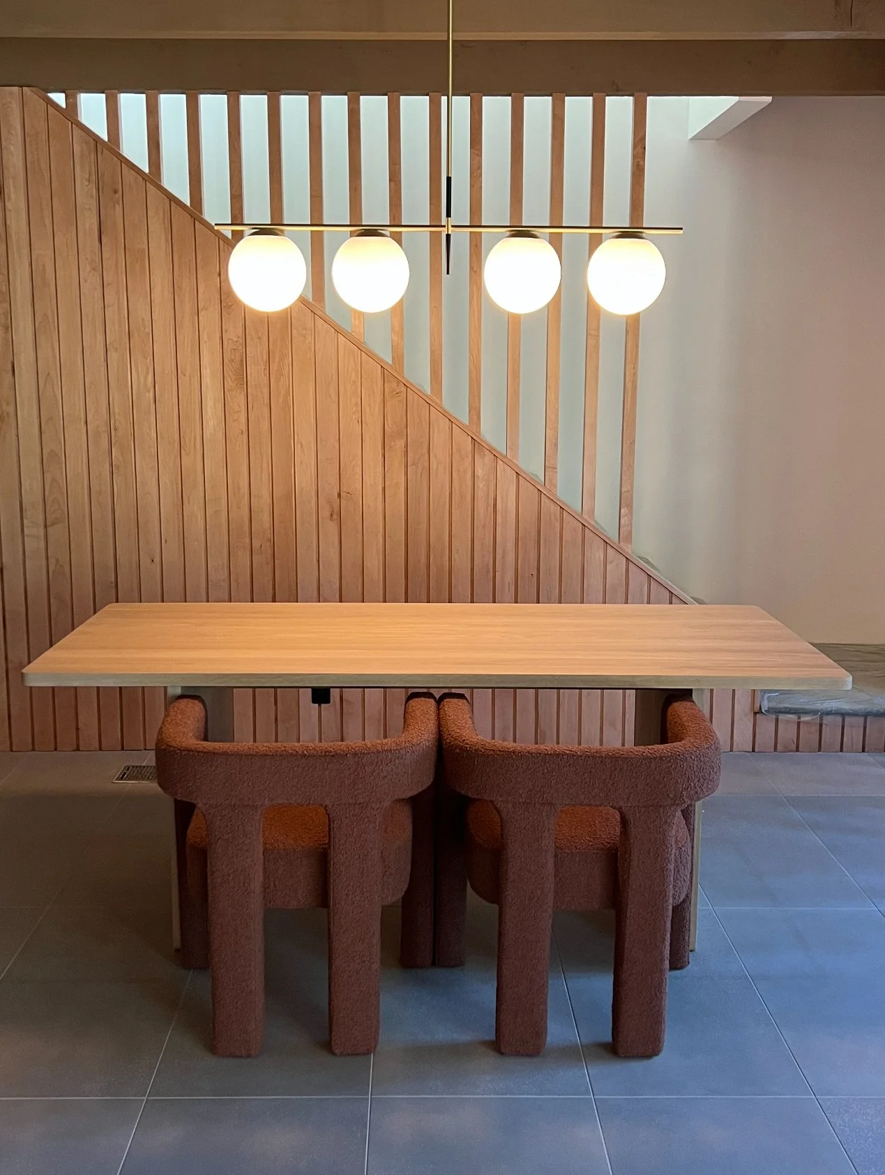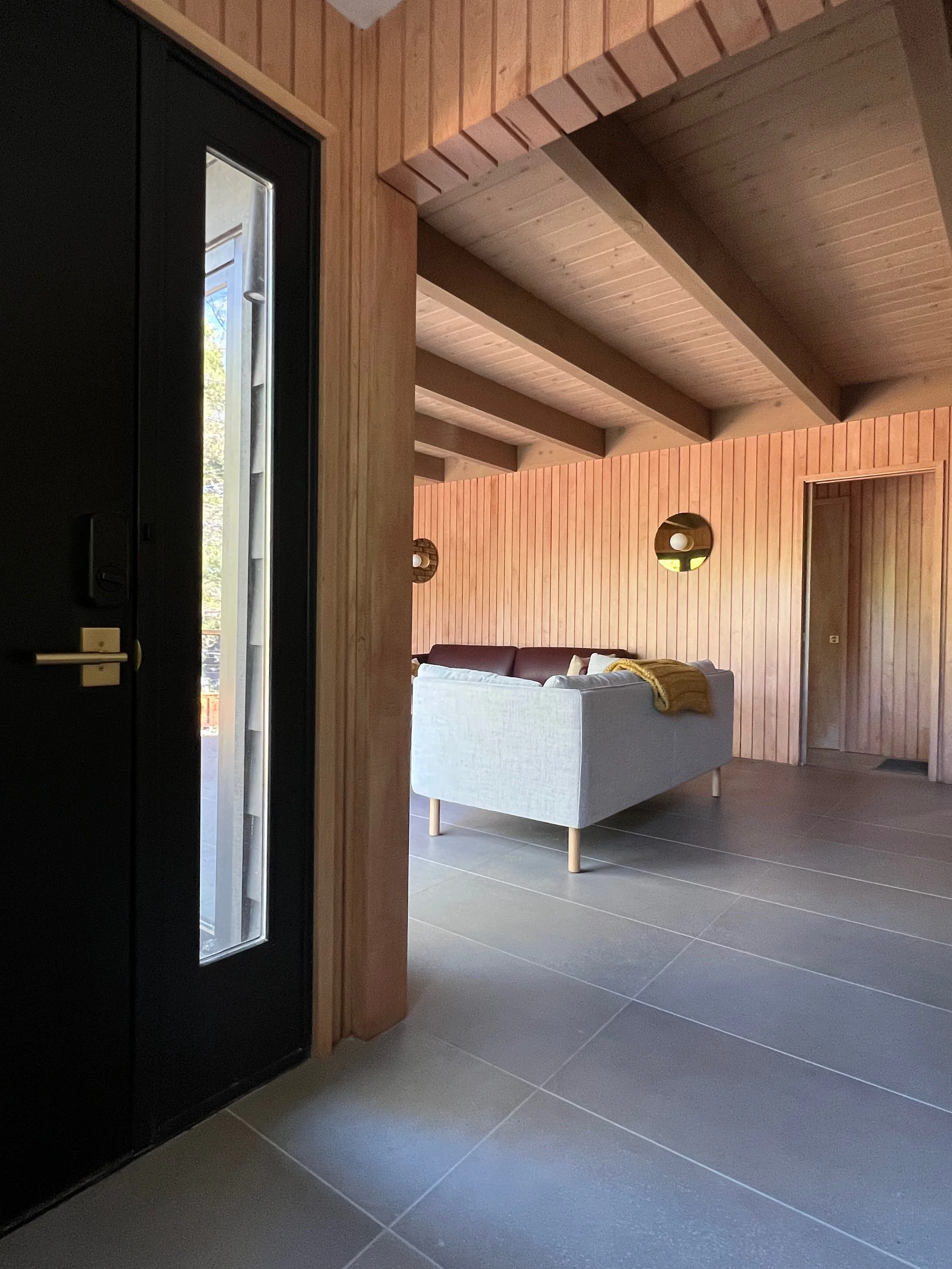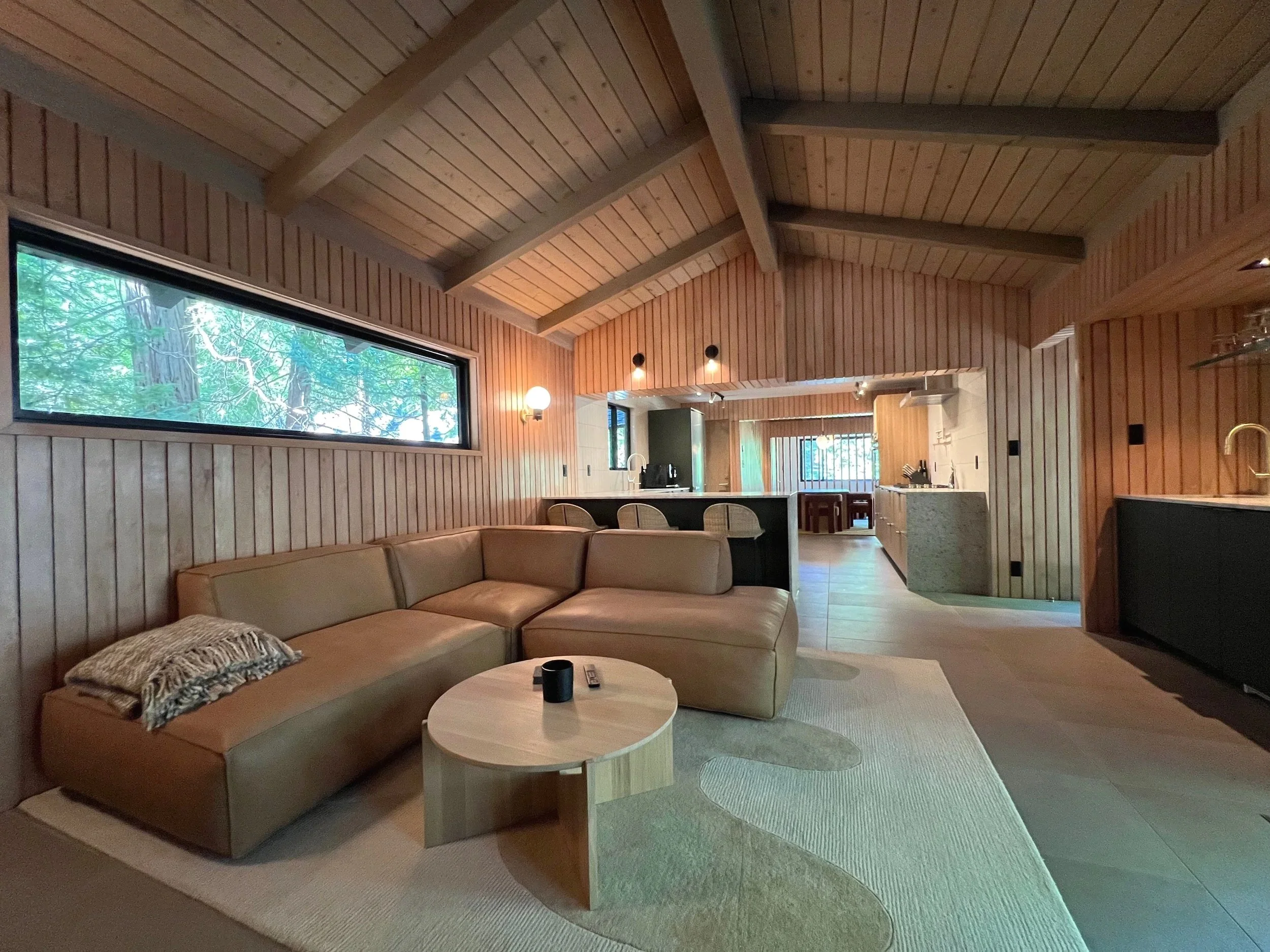 Original ceilings were preserved, custom-stained maple paneling replaced the walls, and while carpeting gave way to radiant porcelain flooring for Lake Arrowhead winters, SO’s nod to the home’s original character is a plush deep-olive carpeted staircase, adding warmth and acoustic softness. Expansive sliders replaced a picture window, flooding the interior with light and connecting the deck for indoor-outdoor living. The result is a space that feels minimal, warm, and quietly contemporary.