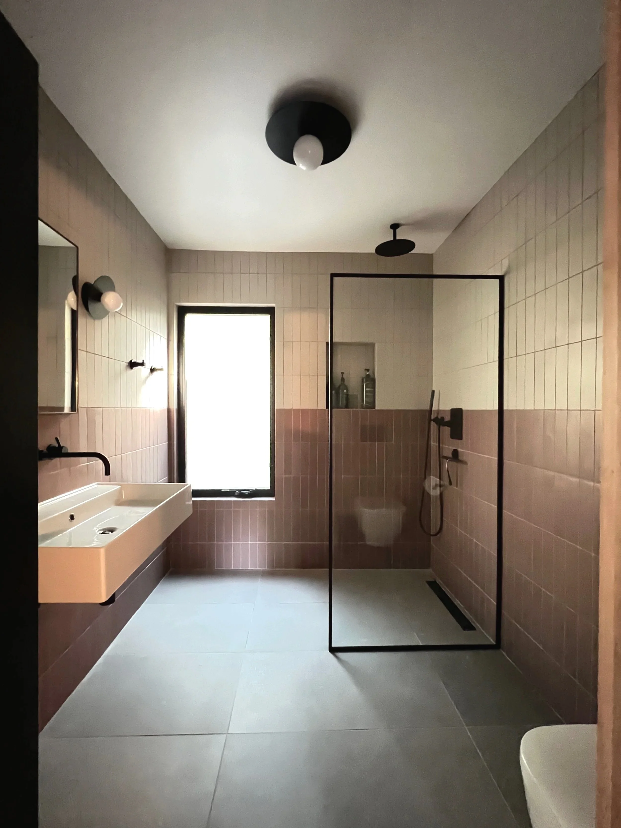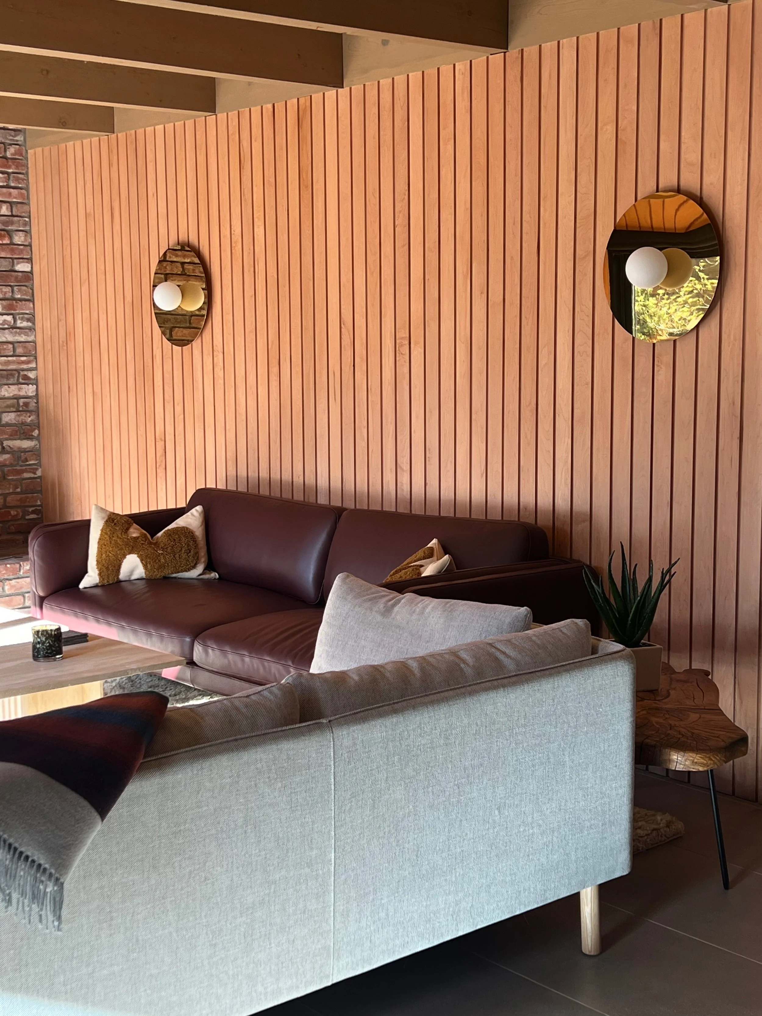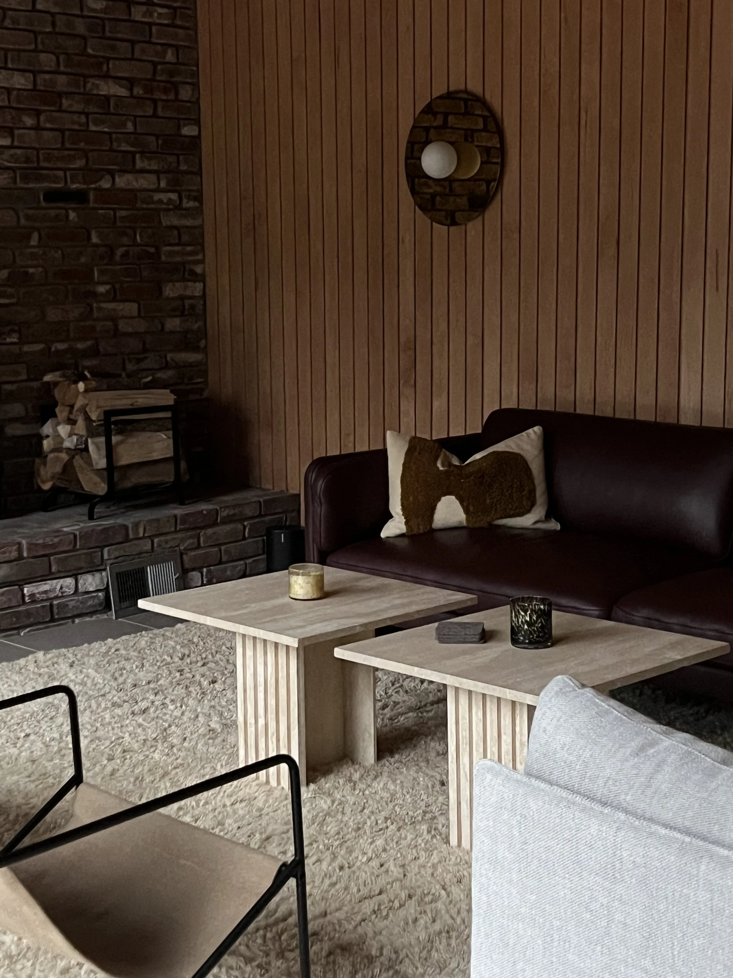 Left : One of the smallest bathrooms SO ever designed, reimagined through light and restraint. By doubling the window replacement size, opening the previously walled in shower, and using wall-mounted elements for a clear floor throughout, the space now feels calm, open, and intentional. Center: Limestone tables with a soft, geometric, Japanese sand-garden sensibility anchor the space, balanced by lighter elements to offset the warmth of the wood. An oxblood leather Pastille sofa designed introduces a vintage ’70s feel, while brass sconces add a quiet but confident statement. Right : An original color-saturated mid-century chalet stained-glass door was replaced with a larger, minimalist Japanese-inspired black door with sidelights, and the original spindled knee wall was reimagined with a more modern, Scandinavian sensibility. Both the sidelights and the partition opened the space and allowed light to move through to the center of the home.