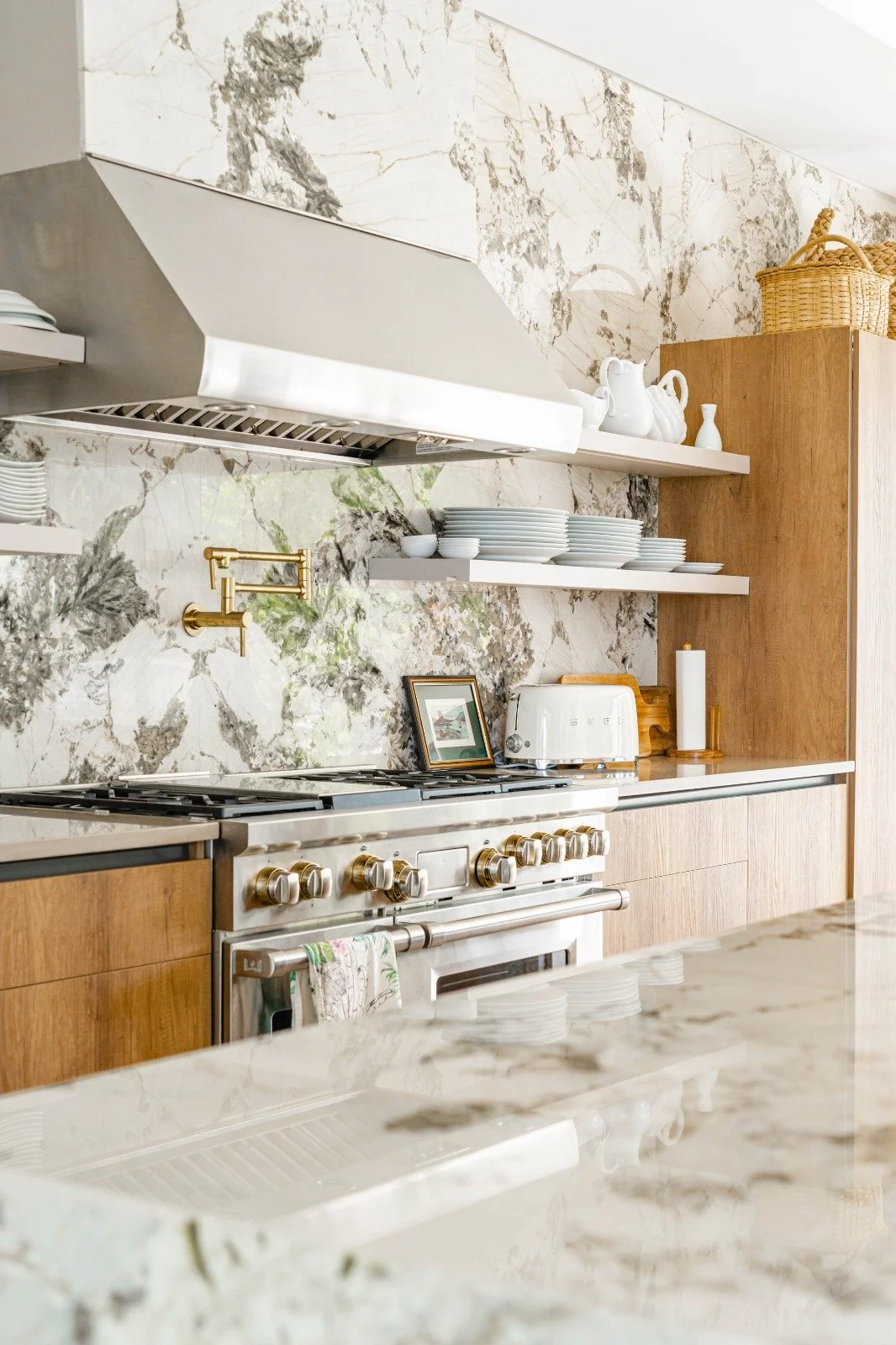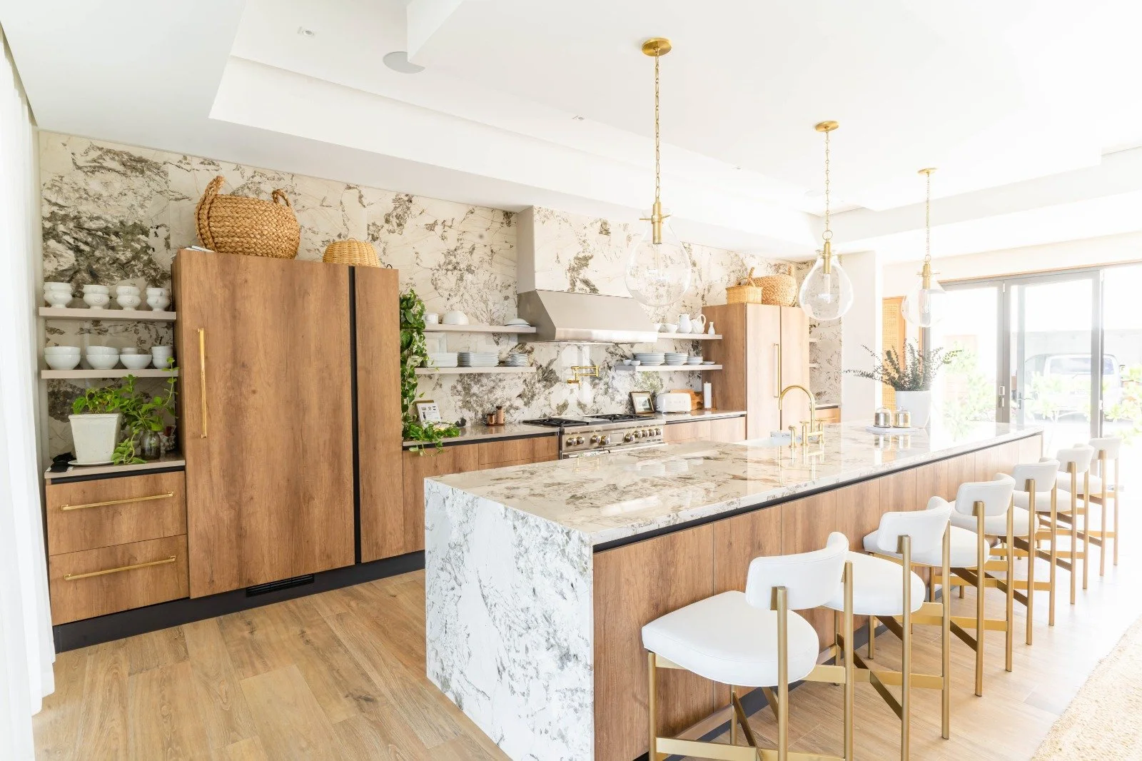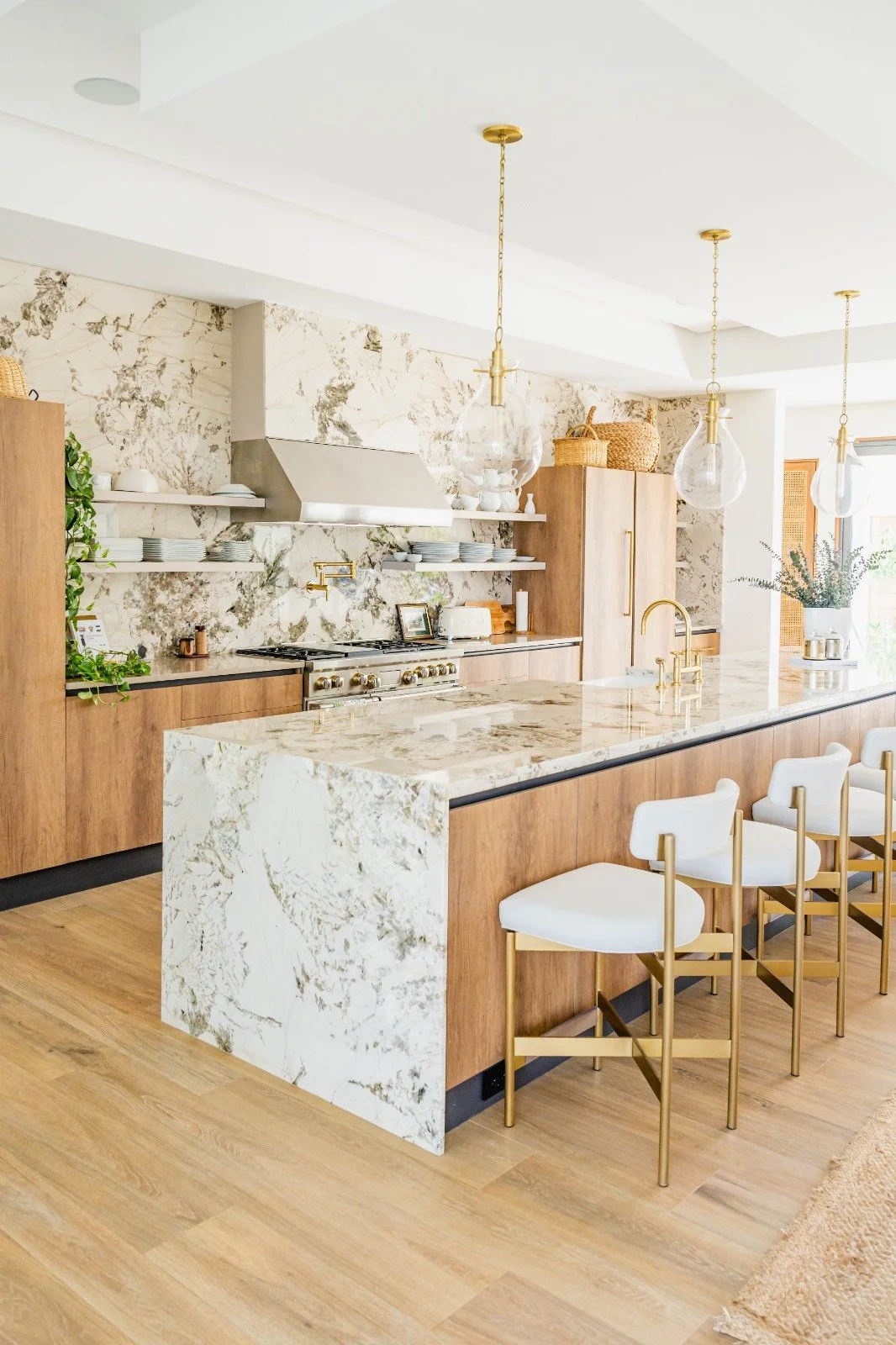 On this particular project abroad, Space Outfit was hired as a consultant for stone sourcing, slabs and tile (which it did via Miami). It’s imperative one choses appropriate materials in tropical locations like Barbados as humidity, saltwater, and sun can quickly degrade materials and take it’s toll. SO chose a porcelain tile for flooring throughout that transitioned from formal indoor living areas to outdoor relaxed poolside lounging. These porcelain tiles are absolutely imperceivable from real wood flooring. For countertops. bars, and backsplashes SO chose a gorgeous white and moss rare exotic natural stone slabs with visible algae elements trapped in the veining to embrace the natural seaside environment of the location.