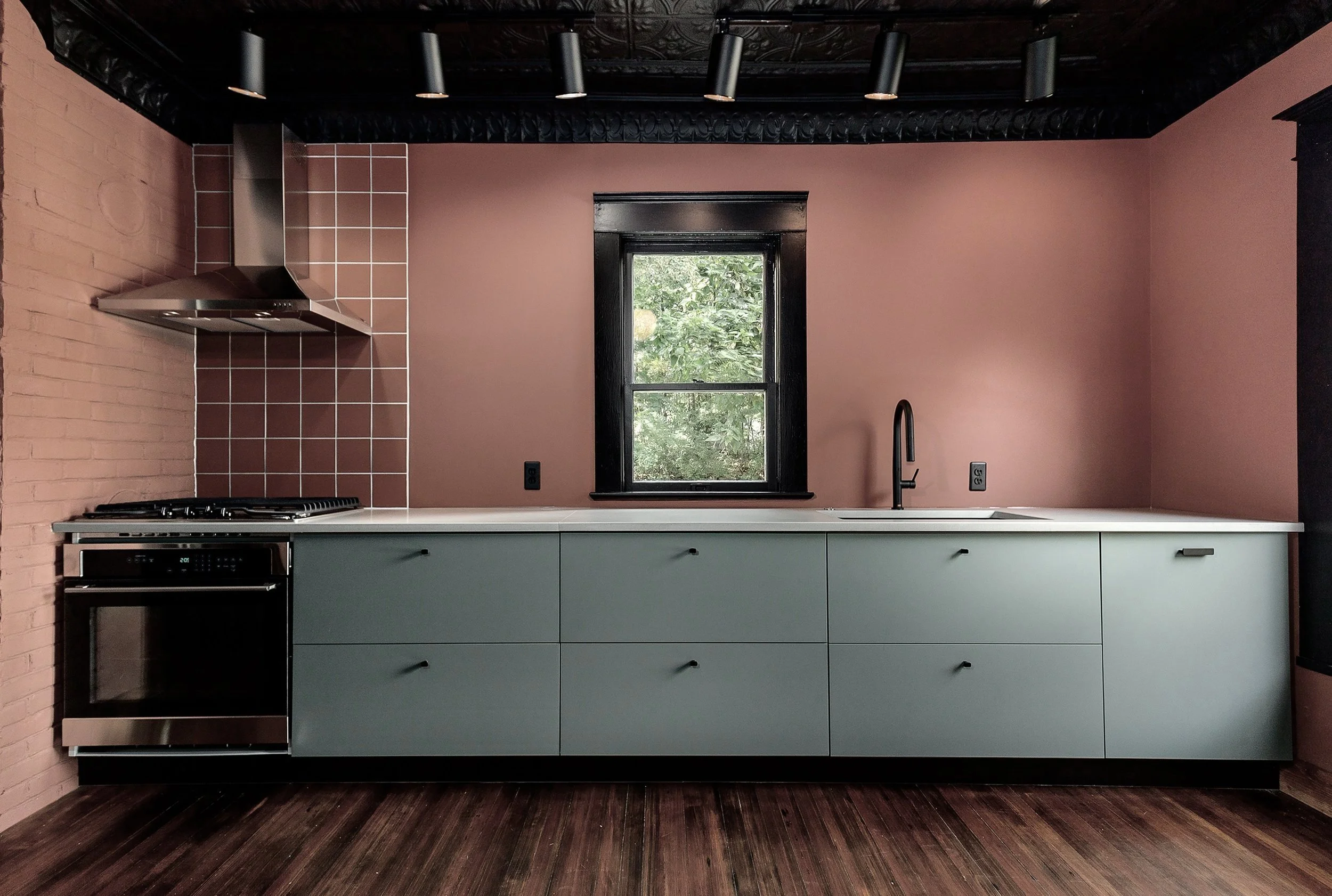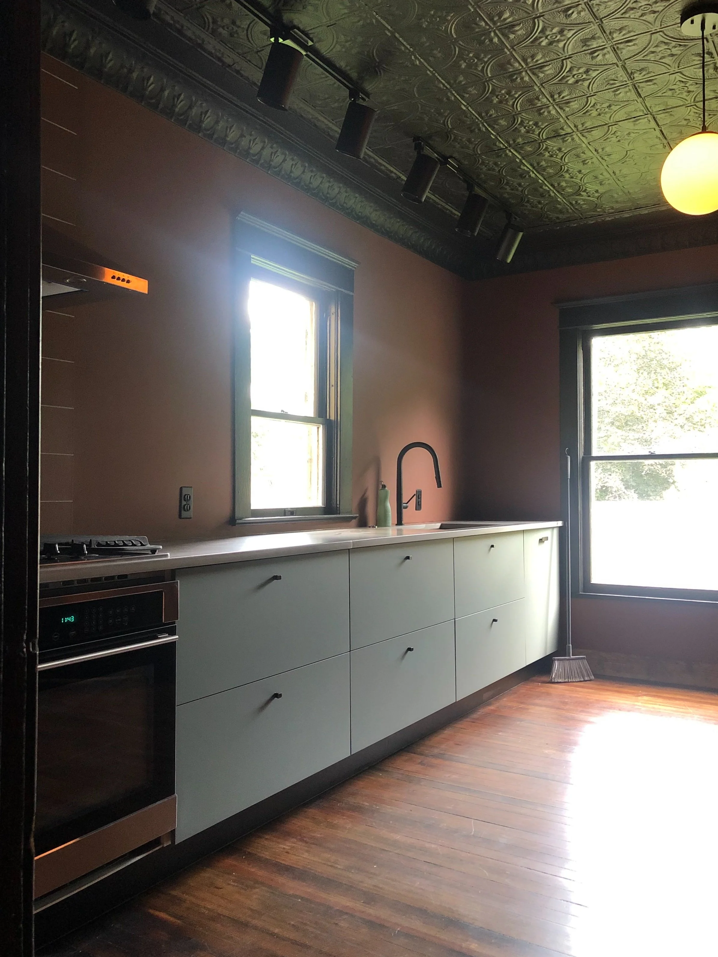 “The Witchery on Woodside” project was a restoration flip of a derelict home built in 1900 in the Hudson Valley in Highland, NY. Space Outfit aptly (and endearingly) named it “The Witchery” due to it’s horror-movie-like state. The home had fallen to ruin. Rain poured through it’s long neglected roof—watering the woodwork, wisteria and poison ivy that climbed through the broken original windows. With reverence for history and architecture, SO looked beyond the vines, cobwebs, questionable paint choices and saw great potential in the original details like tin and coffered chestnut ceilings, built-in original woodwork, century old wide-plank floors, and 5 panel oak doors. Still salvageable, this Incredible long gone craftsmanship would’ve likely been demoed by another buyer—a sin committed all too often on home renovation shows. Space Outfit preserved it. From stucco to cellar, the before and afters of this passion project below speak for themselves. This architectural gem was resuscitated ON A BUDGET and sold quickly after completion for a record price in the neighborhood.
